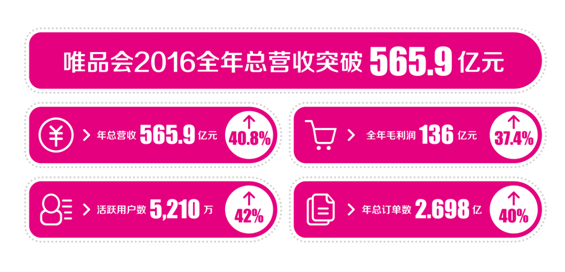 唯品會今天公布了截至2016年12月31日未經(jīng)審計的2016年第四季度及全年財務報表。財報顯示,唯品會在2016年全年總營收565.9億元人民幣,同比增漲40.8%;毛利潤136億元,較上年同期增長37.4%;唯品會全年活躍用戶數(shù)同比勁增42%,達到5210萬。第四季度,唯品會季度凈營收達到189.8億元人民幣,同比增長36.5%,遠超過預期水平。(美通社,2017年2月21日廣州)